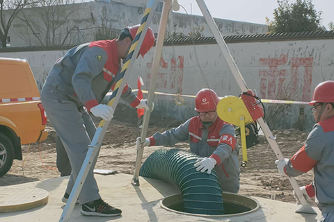检修作业流程:检测含氧量,鼓风吹氧,安全下入井底,进行检修。